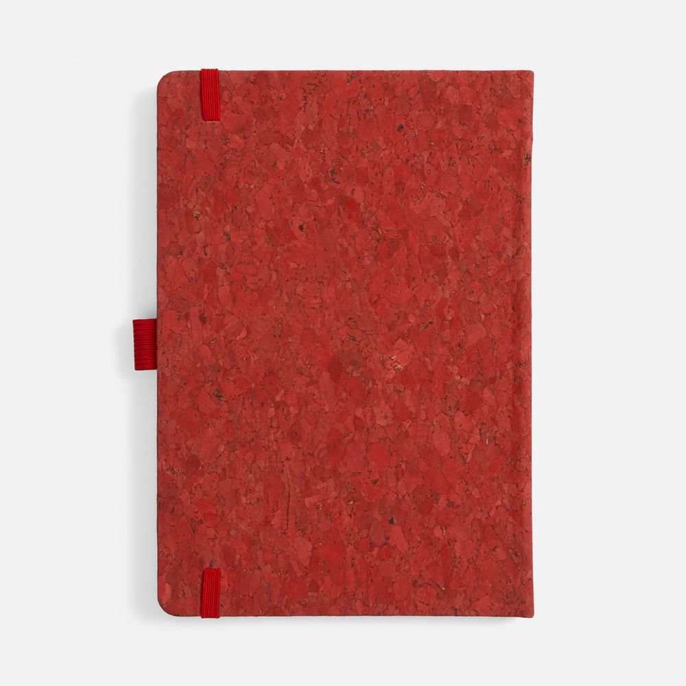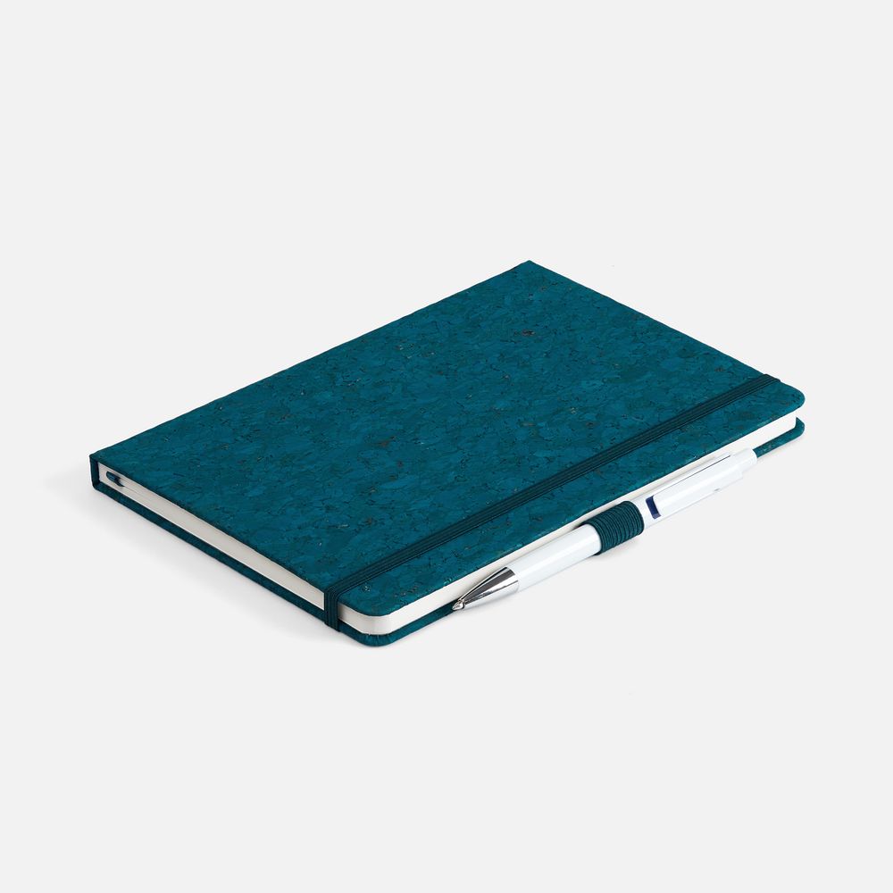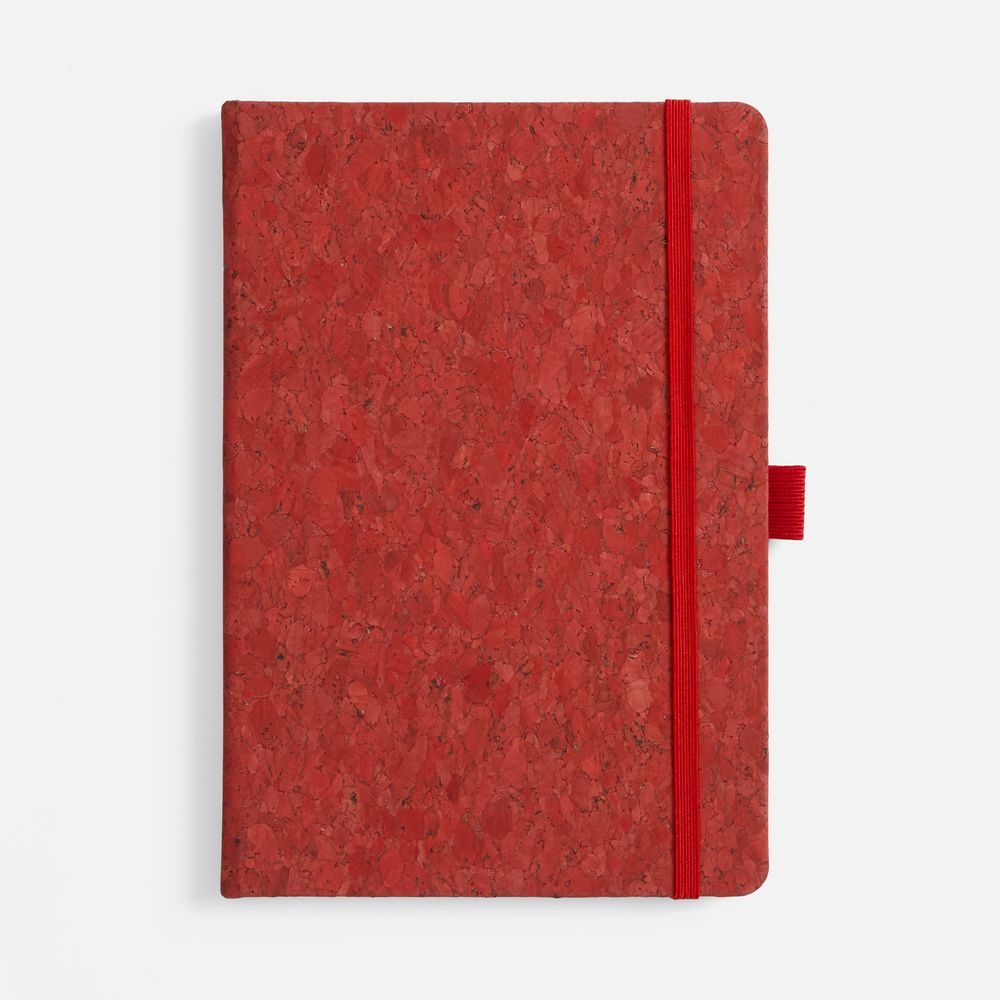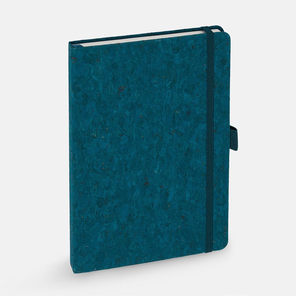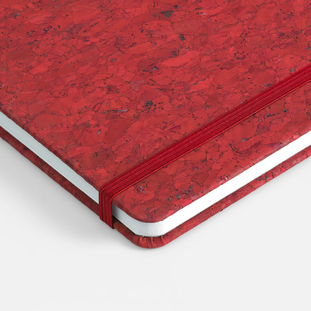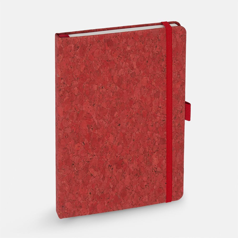 Блокнот с твердой обложкой из из натуральной окрашенной пробки, дополнен петлей-резинкой для ручки, ляссе и резинкой в цвет обложки.