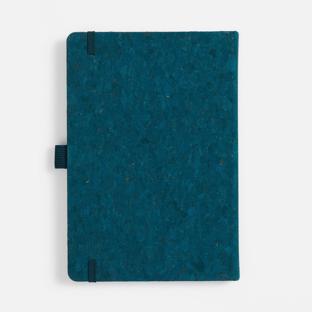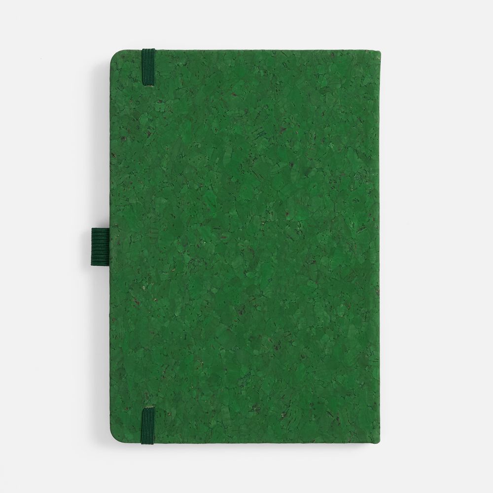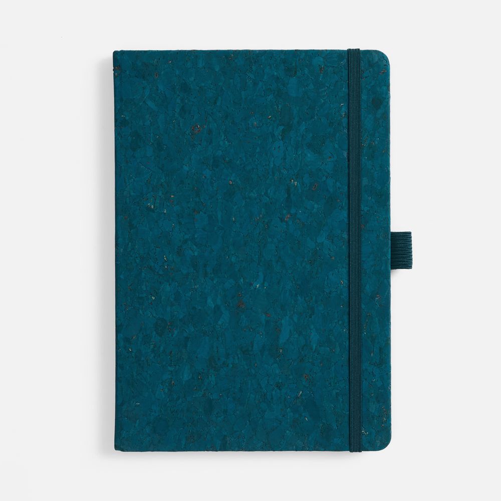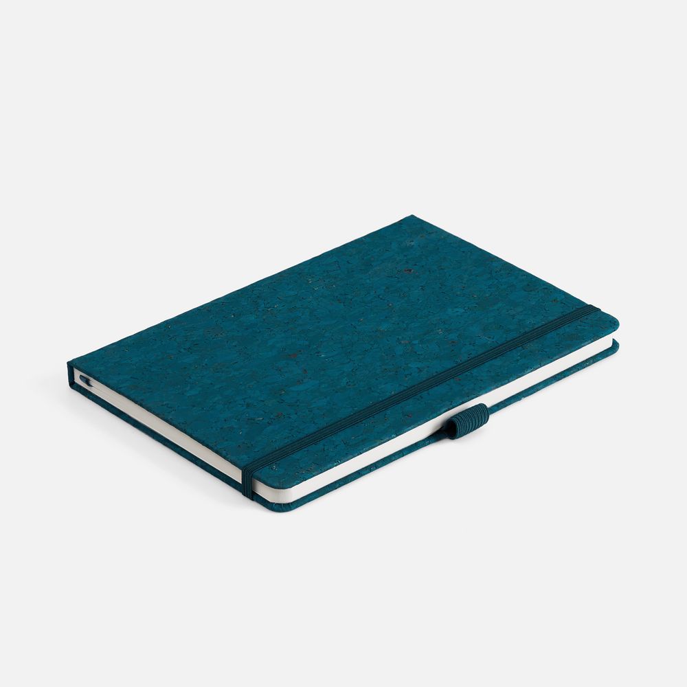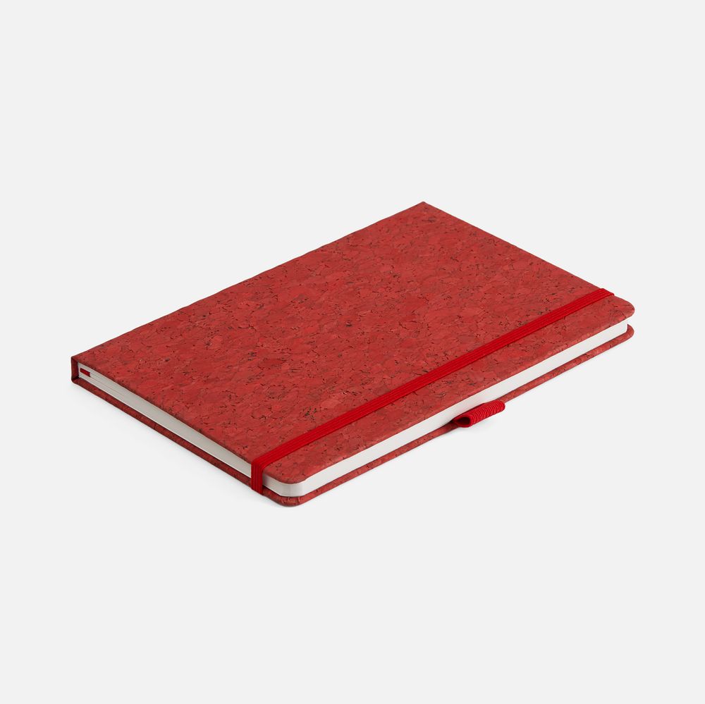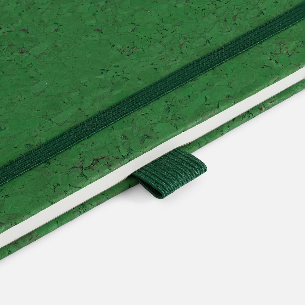 Блокнот с твердой обложкой из из натуральной окрашенной пробки, дополнен петлей-резинкой для ручки, ляссе и резинкой в цвет обложки.