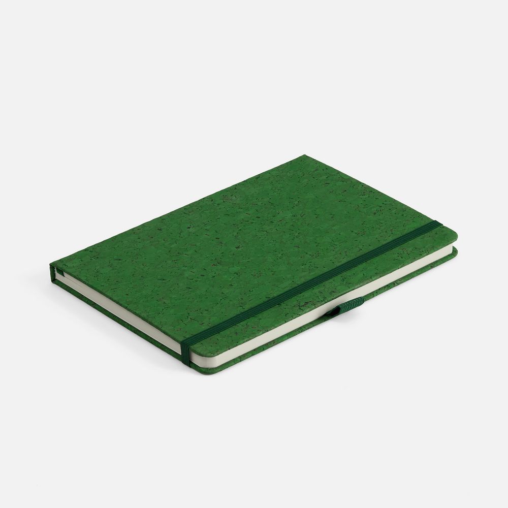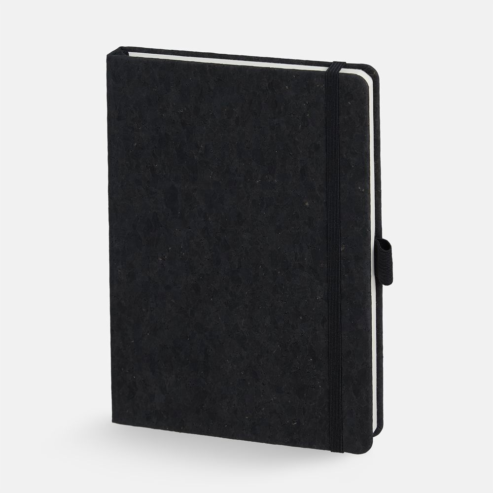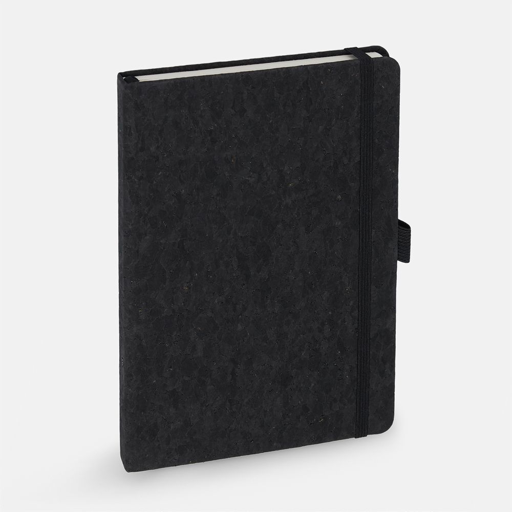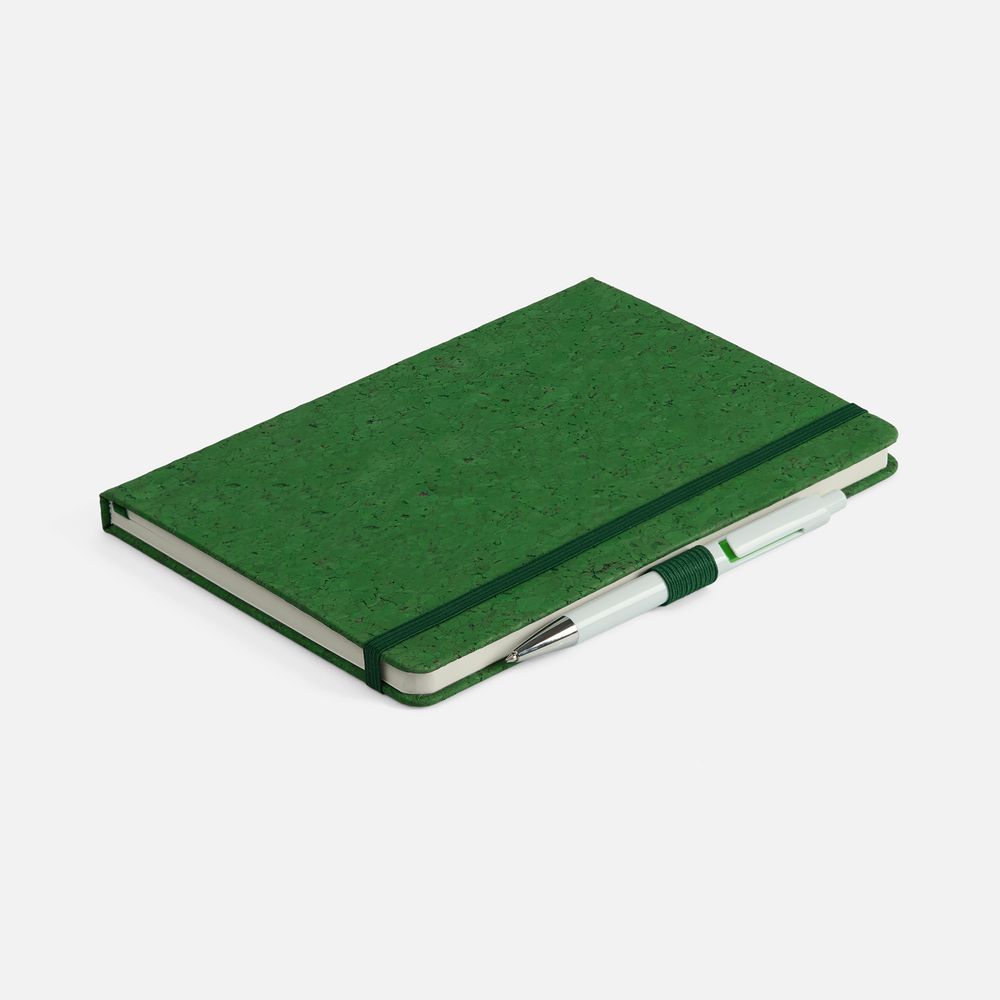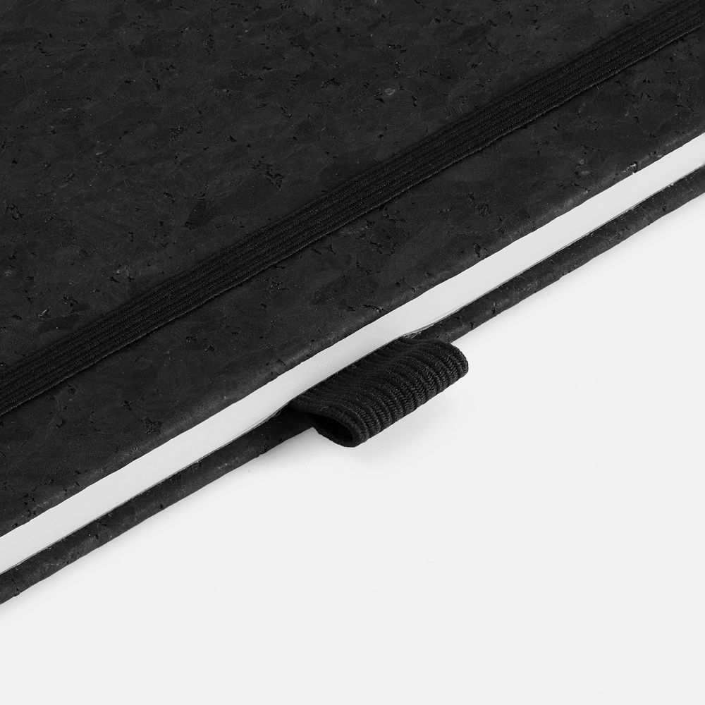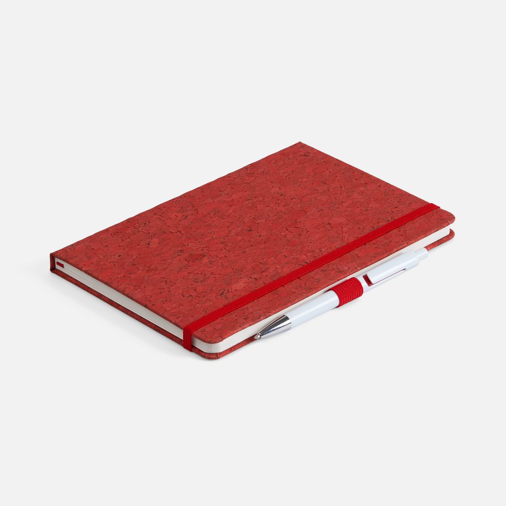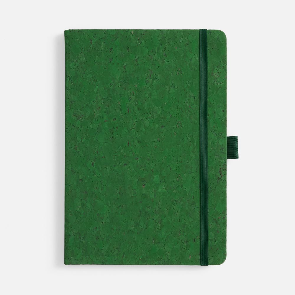Блокнот с твердой обложкой из из натуральной окрашенной пробки, дополнен петлей-резинкой для ручки, ляссе и резинкой в цвет обложки.