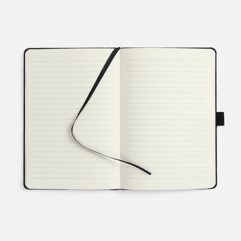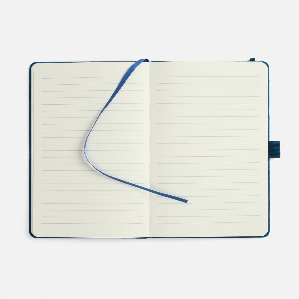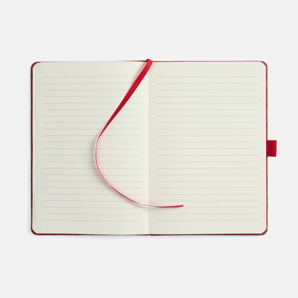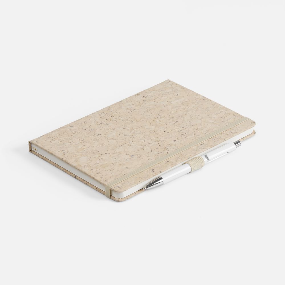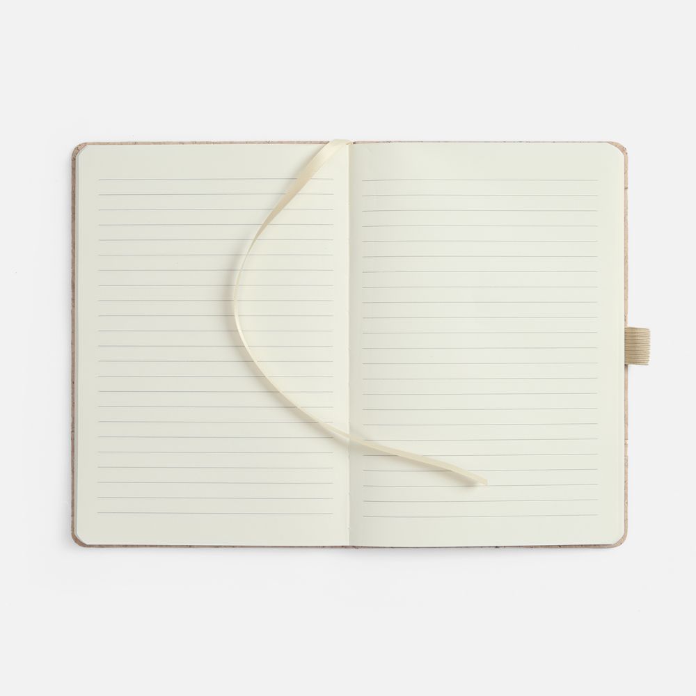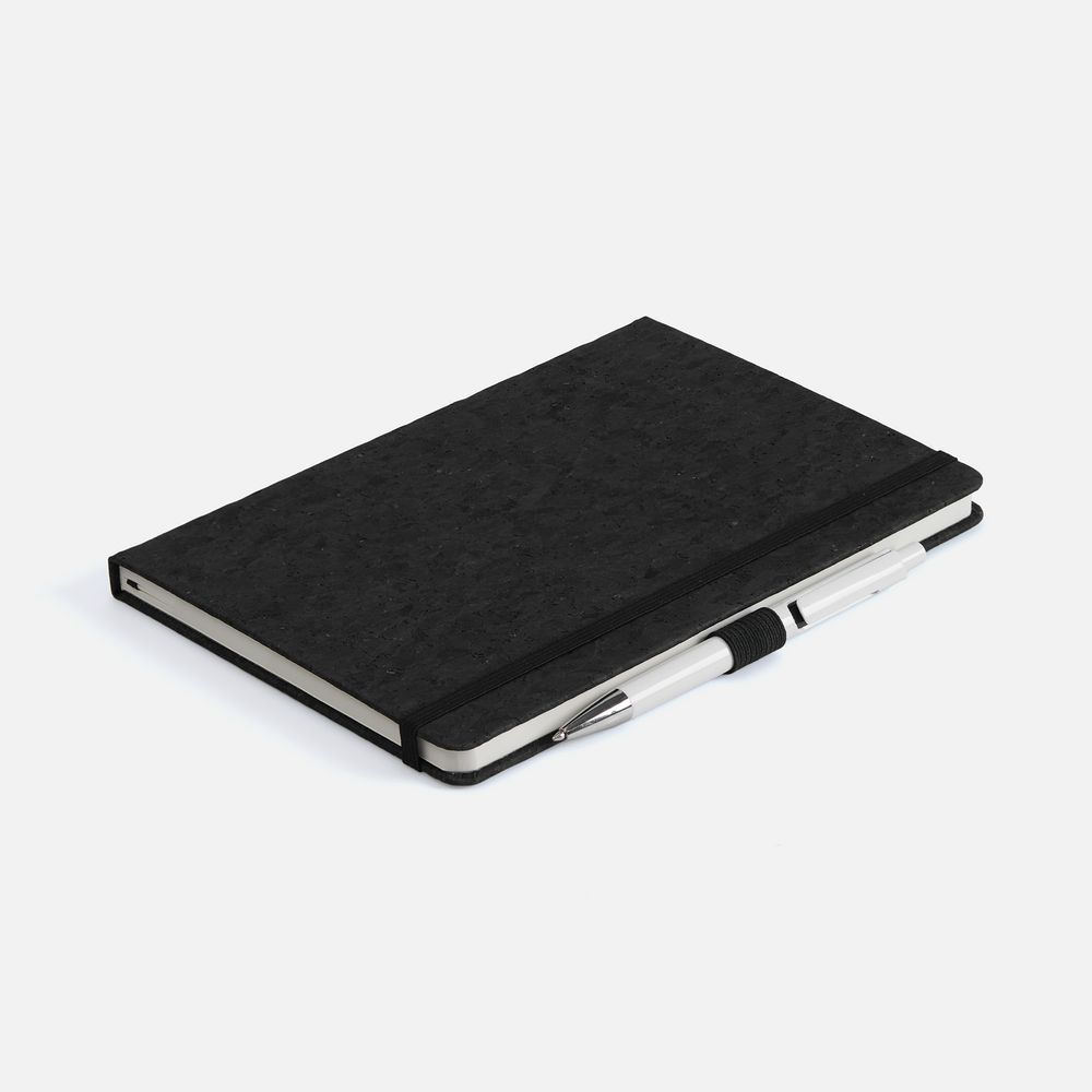Блокнот с твердой обложкой из из натуральной окрашенной пробки, дополнен петлей-резинкой для ручки, ляссе и резинкой в цвет обложки.