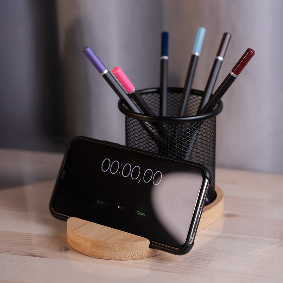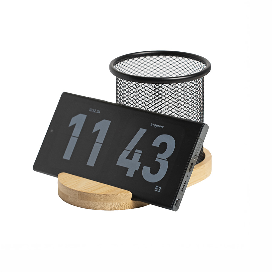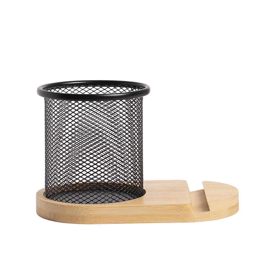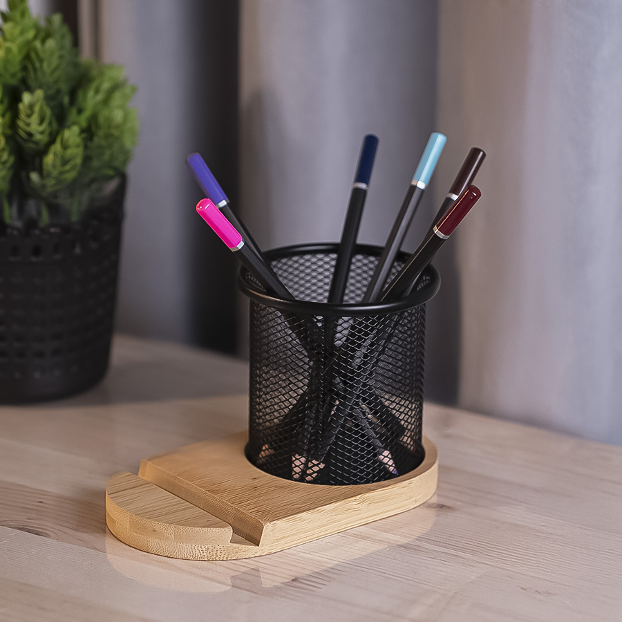 Как правило, на рабочем столе нам всегда не хватает места, т.к. каждый из однофункциональных предметов претендует на полезную площадь. Вашему вниманию предлагается дуэт, в котором объединены 2 функции. Это подставка для телефона из бамбука и металлический стакан-подставка под пишущие принадлежности. Комплект изготовлен из природных материалов. Позволяет организовать свое рабочее пространство стильно и компактно.